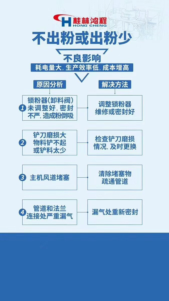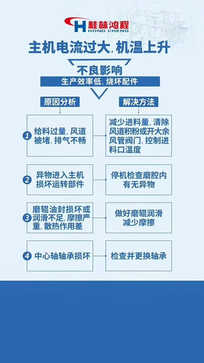 1.風機振動過大 2.石灰磨粉機不出粉或者出粉少 3.傳動裝置和風機油條發(fā)熱 4.石灰磨粉機主機振動或者噪音過大 5.石灰磨粉機軸承不工作 6.石灰磨粉機主機電流過大,機溫上升。